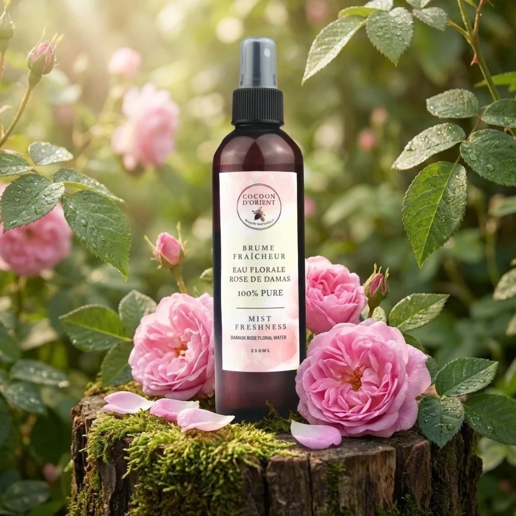 Brume Fraicheur 100% rose de Damas de Cocoon d'Orient apaise les rougeurs, même celles liées à la couperose, tout en calmant les tiraillements et les irritations des peaux sensibles ou réactives.