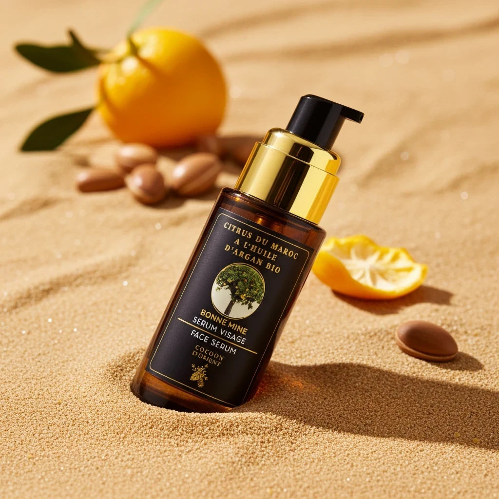 BONNE MINE est un Sérum visage éclat à l’huile d’Argan bio & Citrus.