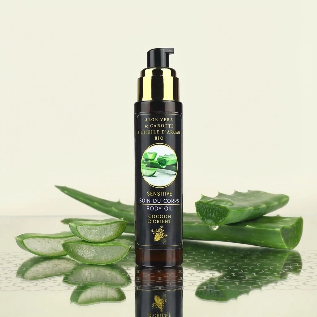 Soin corps SENITIVE naturel hydratant enrichi en huile d’argan bio, Aloe Vera et carotène végétal.
