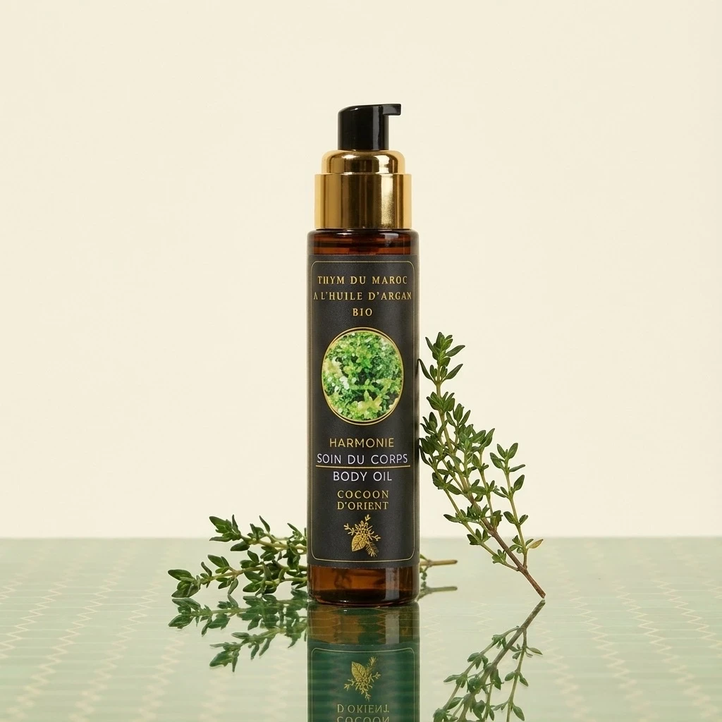 Huile de massage relaxante HARMONIE enrichie en Argan bio, thym, romarin et eucalyptus.