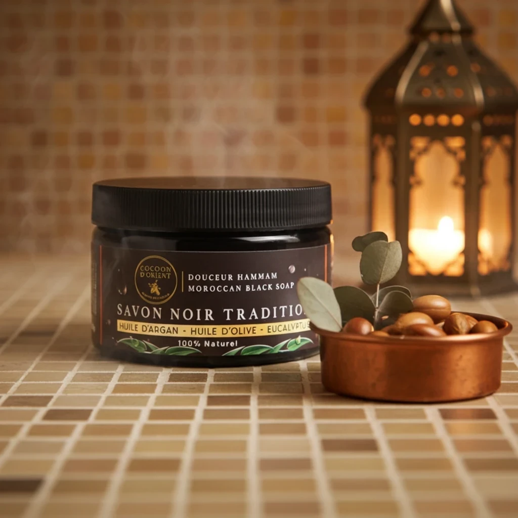 SAVON NOIR TRADITIONNEL est un exfoliant, inspiré du hammam marocain qui purifie la peau, élimine les impuretés et prépare parfaitement l’épiderme au gommage. Enrichi en huile d’argan bio et en eucalyptus, il adoucit, assainit et laisse la peau nette, souple et prête à recevoir l’hydratation.