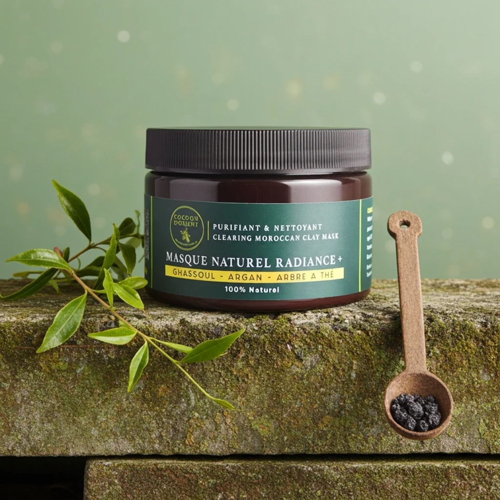 MASQUE PURIFIANT NATUREL RADIANCE + est formulé avec du Ghassoul, de l’huile d’Argan bio et de l’arbre à thé.